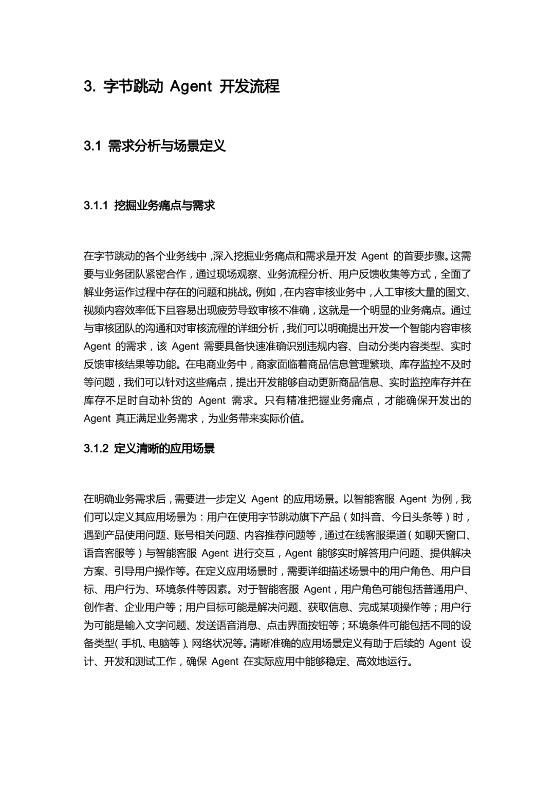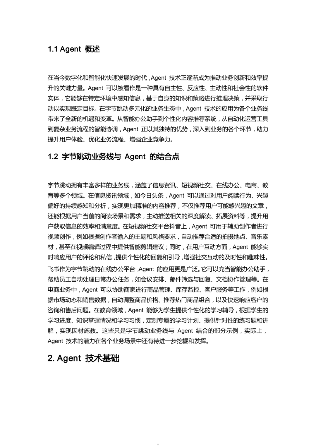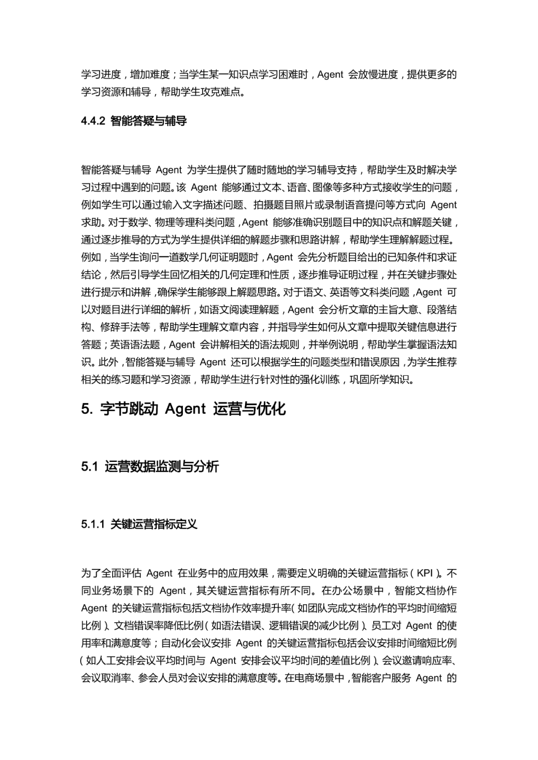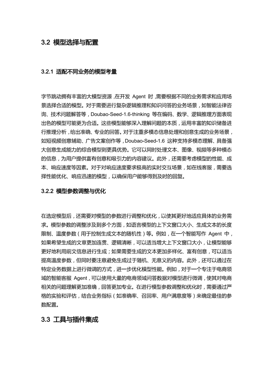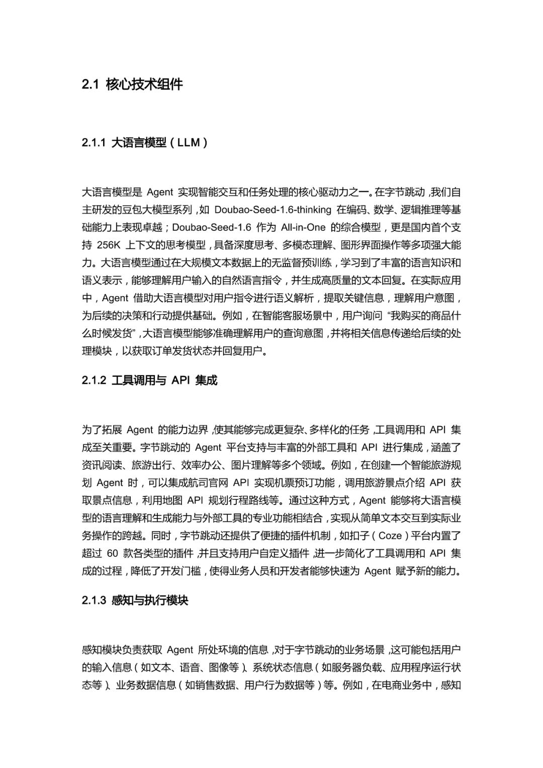 手册开篇明确 Agent 作为具备自主性与社会性的软件实体,深度融入办公、电商、内容创作、教育等多元业务线,解决核心业务痛点。技术层面,以豆包系列大模型为核心,搭配 API 工具集成、感知与执行模块,采用分层架构设计,通过模块间高效协同保障系统稳定运行。