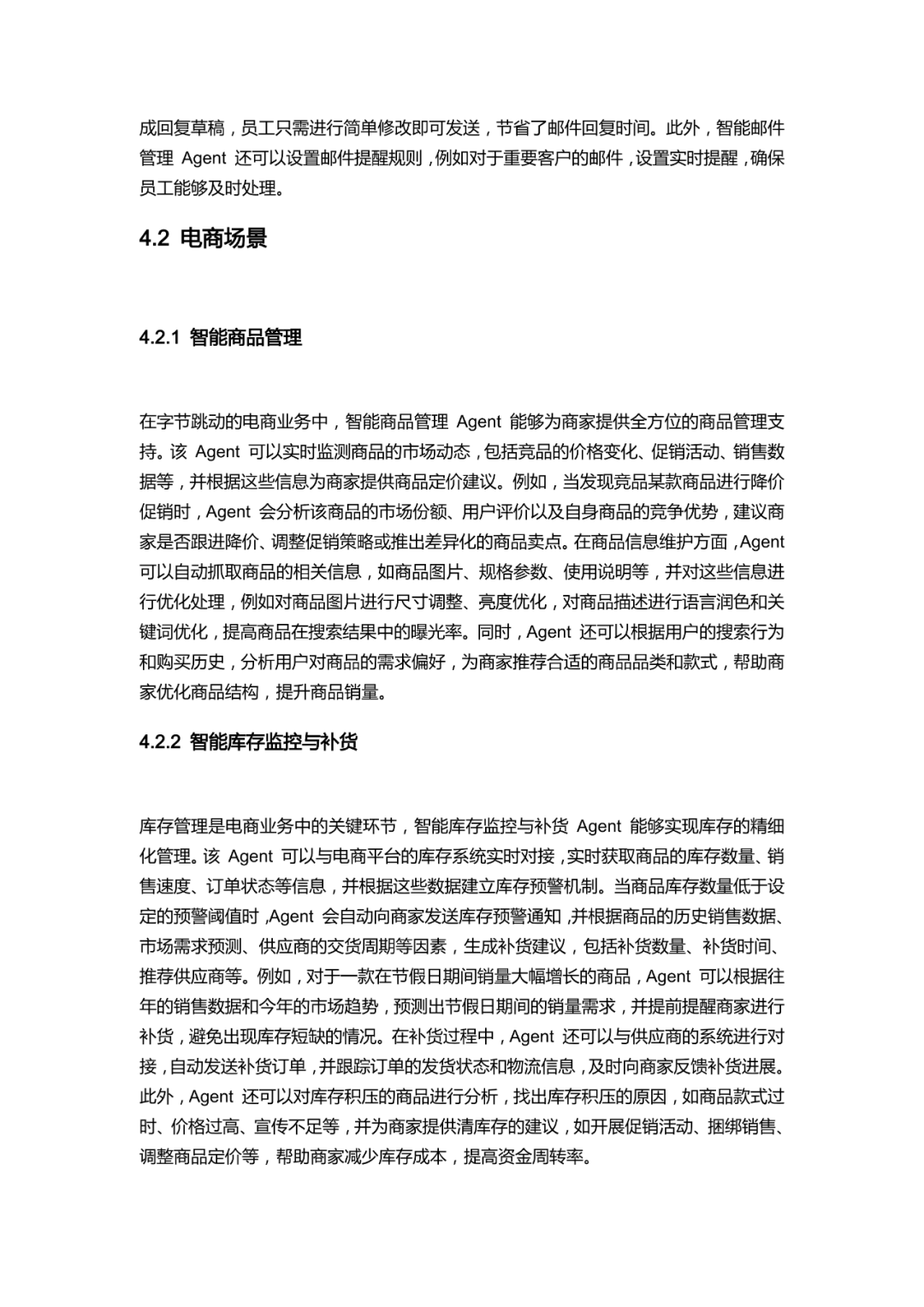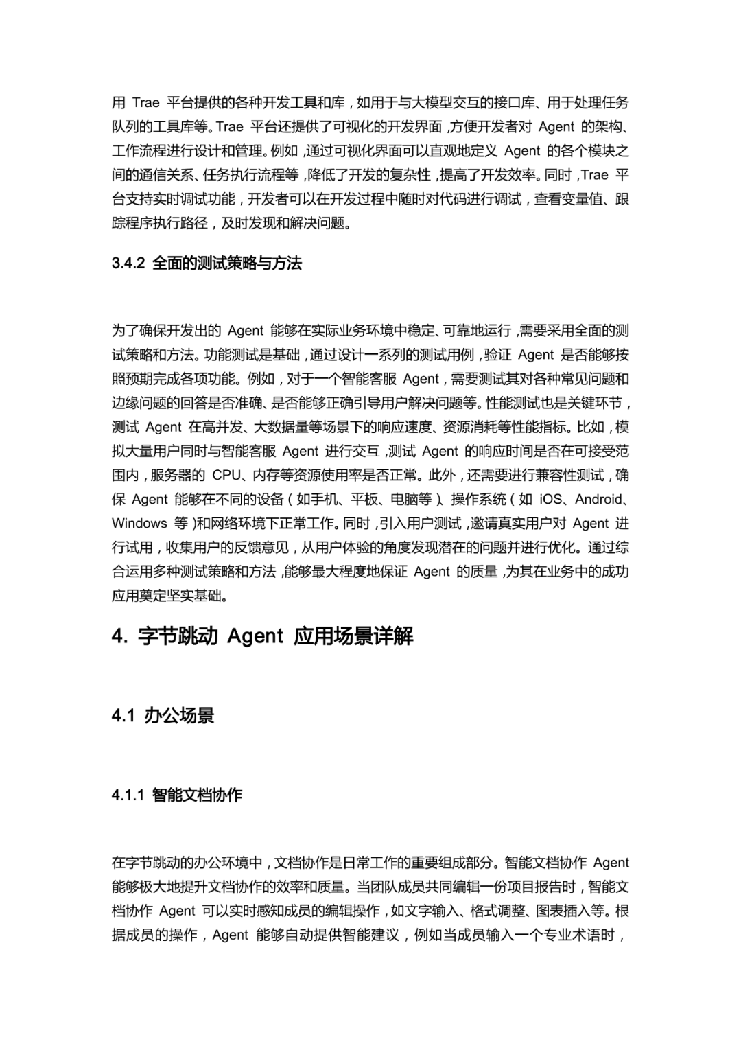 开发流程遵循需求分析与场景定义、模型选择与配置、工具插件集成、开发与测试的标准化路径,依托扣子平台与 Trae 平台降低开发门槛。应用场景中,办公场景实现文档协作、会议安排等自动化;电商场景覆盖商品管理、库存监控与智能客服;内容创作场景提供创意辅助与内容优化;教育场景聚焦个性化学习计划与智能答疑。