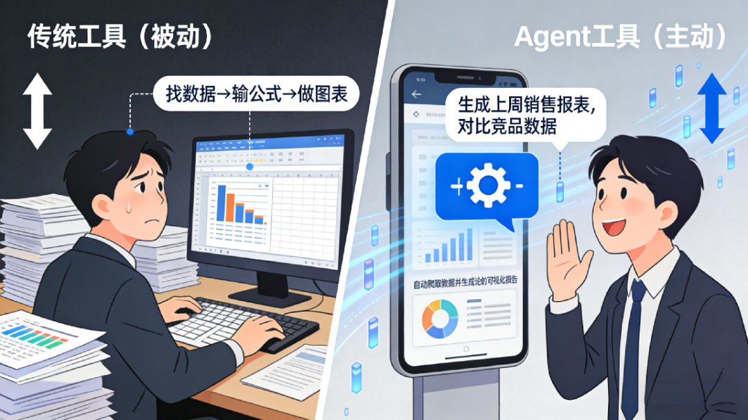 和传统的软件工具比,它最大的不同就是“主动性”。比如你用Excel做报表,得自己找数据、输公式、做图表;但用数据分析Agent,你只要说“生成上周的销售报表,对比下竞品数据”,它就会自己爬取数据、整理计算、生成带结论的报告。