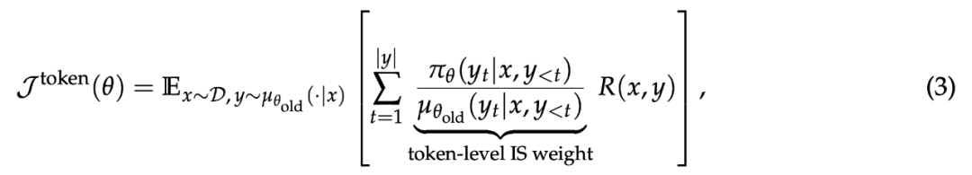 为了使上述一阶近似有效,需要满足一个关键条件:目标策略 π_θ 与 rollout 策略 μ_{θ_old} 必须足够接近。这一点乍看不太直观,因此为了便于理解,对于给定的提示 x 和任意 token y_t,团队将其重要性采样权重(IS)重写为: