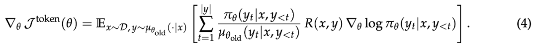 这一梯度形式实际上就是带 token 级重要性采样权重的基本策略梯度算法(REINFORCE)。核心洞察是:公式 (3) 中的 token 级目标可以视为公式 (1) 中序列级目标的一阶近似。也就是说,团队用一个更易优化的 token 级替代目标来逼近真正希望最大化的序列级期望奖励。