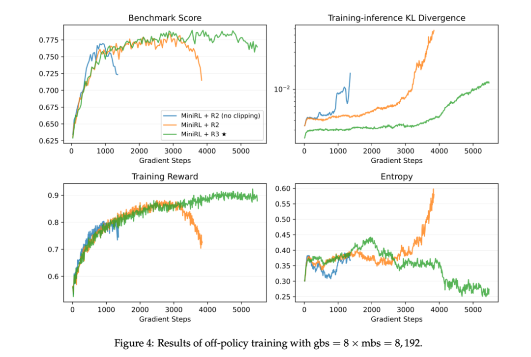 - 在引入 off-policy 更新以加速收敛时(即将大规模生成的响应批次拆分成多个 mini-batch 进行多次梯度更新),要缓解因策略陈旧而导致的不稳定性,就必须同时使用 Clipping 与 Routing Replay;