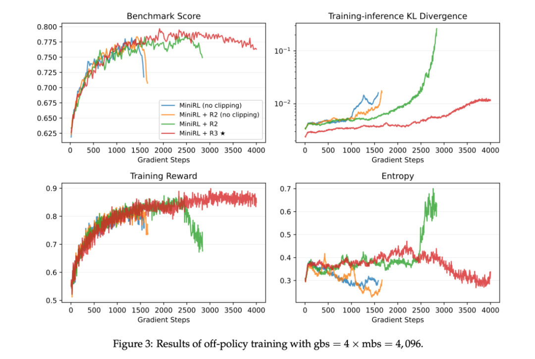 从下图 2 至图 4 中,团队得到了以下观察结果与结论:一旦引入 off-policy 更新,Routing Replay 与 clipping 都成为实现稳定训练的关键要素。