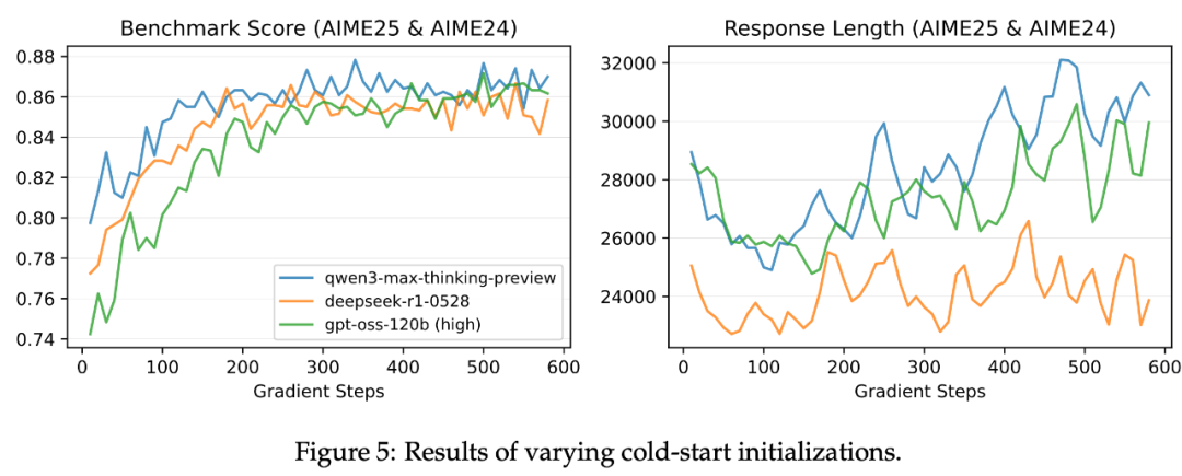 在下图 5 中,团队展示了三种不同的冷启动初始化方式最终都取得了相近的性能。这一现象表明,研究重点应更多放在强化学习(RL)方法本身,而不必过度关注冷启动初始化的具体细节。