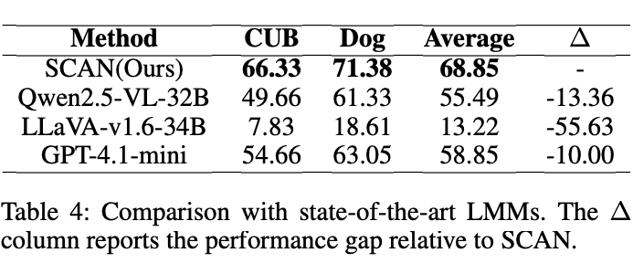 进一步地,本文还与当前主流的多模态大模型进行对比。从下表中结果可以看出,即便是经过大量细粒度数据进行训练的 Qwen2.5-VL 仍劣于本文方法(SCAN)。