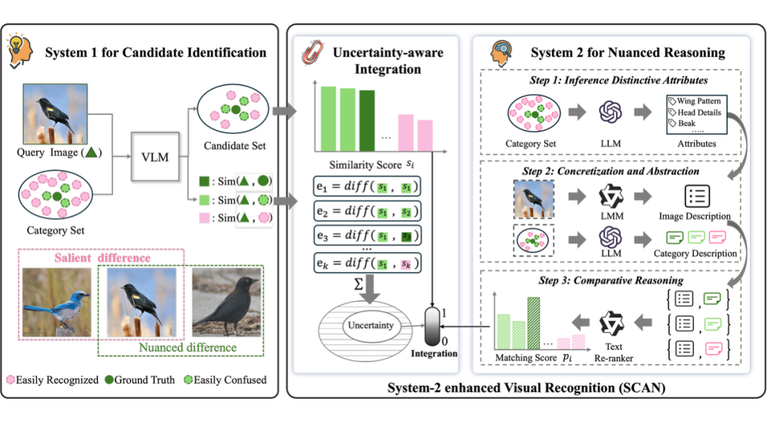 针对这一问题,在 AAAI 2026 的论文中,来自四川大学、南洋理工大学的研究团队受到人类认知模式的启发,提出了 SCAN(System-2 enhanced visual recognition),一种无需训练、不依赖标注数据或是参考样本、在推理时即插即用的 VLM 增强方法。