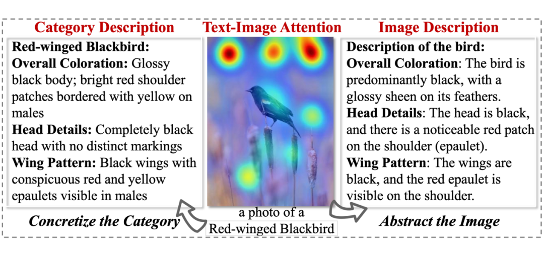 因此,对于待识别的图像,同样利用 LMM 基于特定属性进行描述,仅保留与类别区分相关的细节信息,过滤掉背景等无关因素。最终,如下图所示,获得了基于同一组区分属性的类别描述和图像描述。