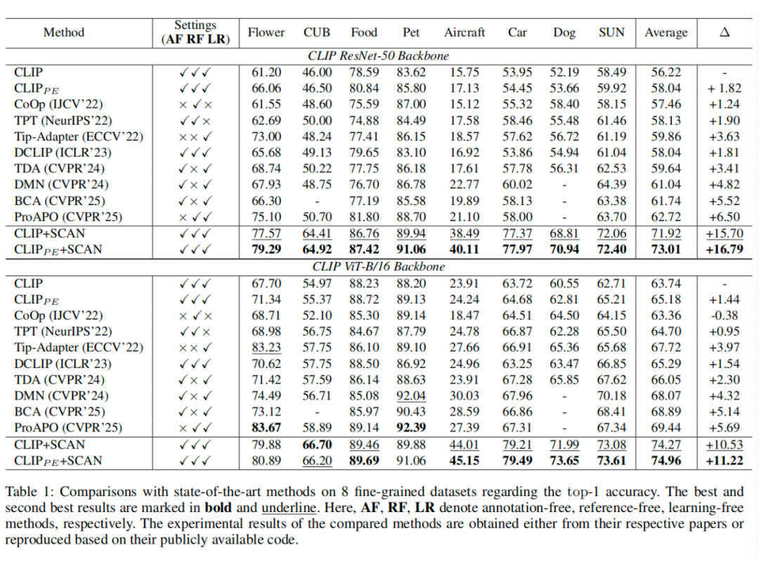 在 Flowers-102、CUB-200、Food-101 等八个细粒度数据集上,SCAN 能够在无需标注数据、无需参考样本、无需额外训练的前提下,显著地提升 VLM 的细粒度识别能力。