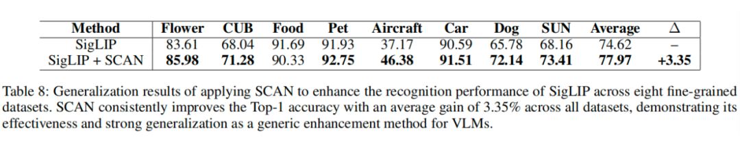 对于在更大规模数据上训练的 SigLIP 上,引入 SCAN 仍然能使平均识别准确率提升 3.35%,表明了 SCAN 作为一种即插即用方法的通用能力。