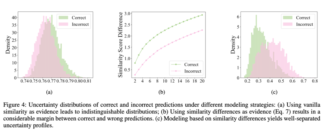 因此研究团队提出以 Top-1 与其余候选之间的相似度差值作为“证据”,设计了一种新的不确定度建模方法。如下图(c)所示,这种不确定度建模方式,在细粒度识别任务中,能够更清晰地区分预测正确与预测错误的情况。