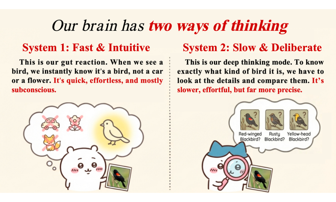 💡 系统 1(快思考):一种直觉驱动的思维模式,依赖经验进行快速决策,响应迅速但容易受偏差影响。例如,在看到上图中的鸟后,大脑会立即形成“这是一只黑色的鸟”的初步判断,并迅速排除外观明显不符的类别,将候选范围限定在“黑色鸟类”相关的若干类别中。