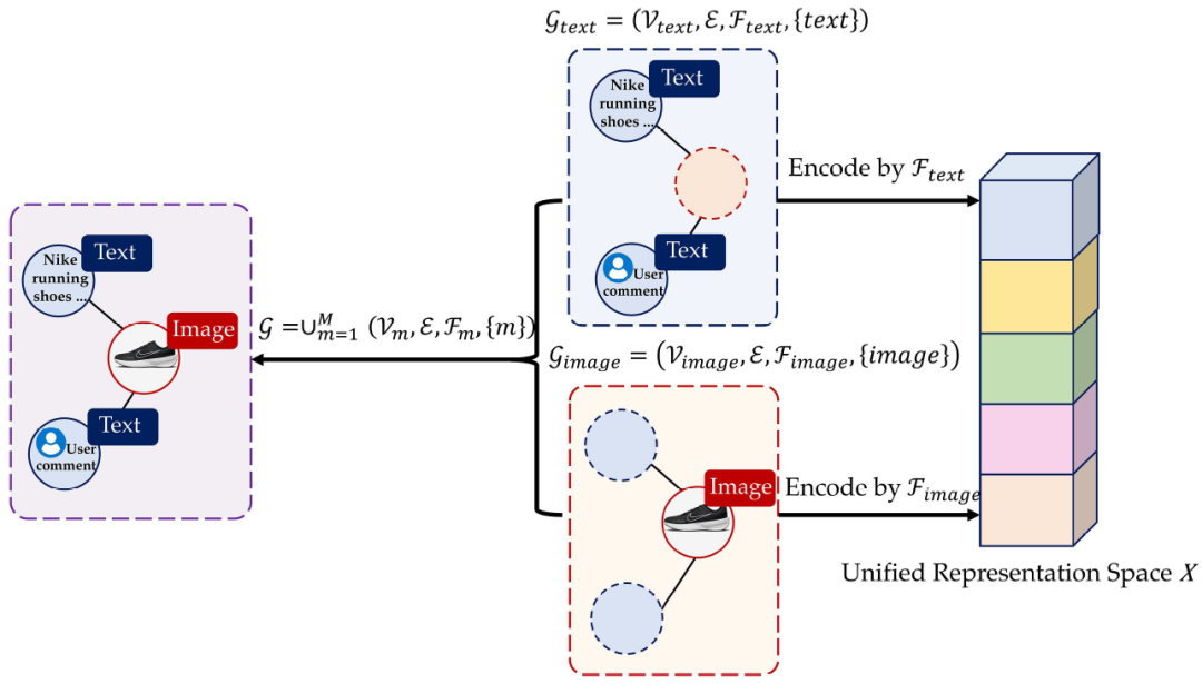 图2 多模态图的说明和运行示例,以具有文本和图像节点的小产品图为例