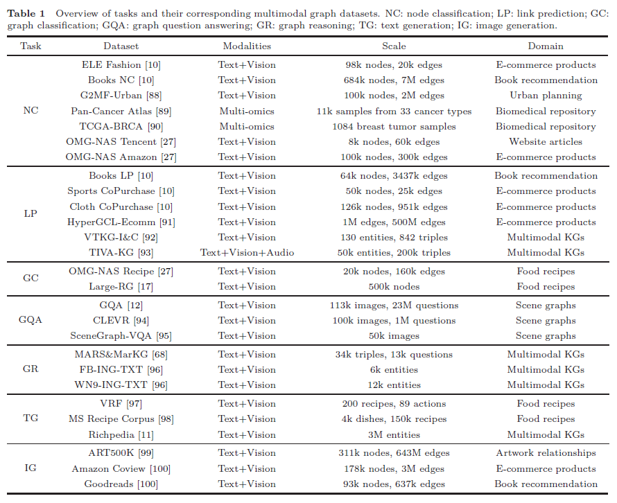 本文系统梳理了当前多模态图学习的代表性数据集,重点比较了其任务类型、模态组合与领域来源。这些数据集融合了图像、文本、视频、音频及生物医学多组学等多源信号,使节点与边的表征更加多样化,支撑了从节点分类、链路预测、图分类、检索与问答,到图文本与图像生成等多种任务设定。我们同样对这些数据集的规模、模态数量与应用场景进行了系统整理与统计,为后续模型评测和方法比较提供了统一参照。