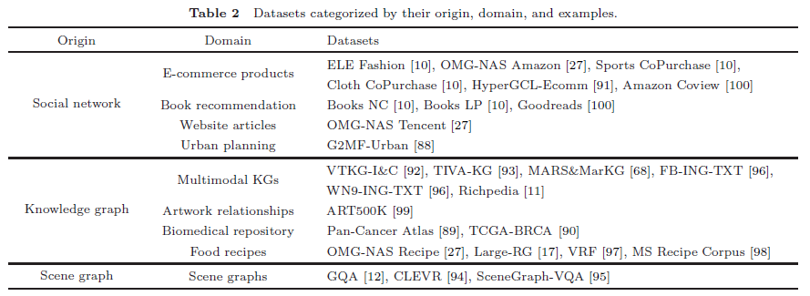 从数据来源看,我们将现有数据集划分为三大类:社交网络类(源于电商、推荐与用户行为数据,反映社会连接模式)、知识图谱类(多模态知识库与专业领域资源,蕴含结构化语义)、以及场景图类(图像中对象及其关系的显式标注,常用于视觉问答任务)。此外,我们逐类分析了不同任务的数据潜力:社交网络数据适用于建模行为关联,知识图谱强调语义推理,场景图则聚焦视觉结构理解,为跨模态图任务提供了多维挑战。