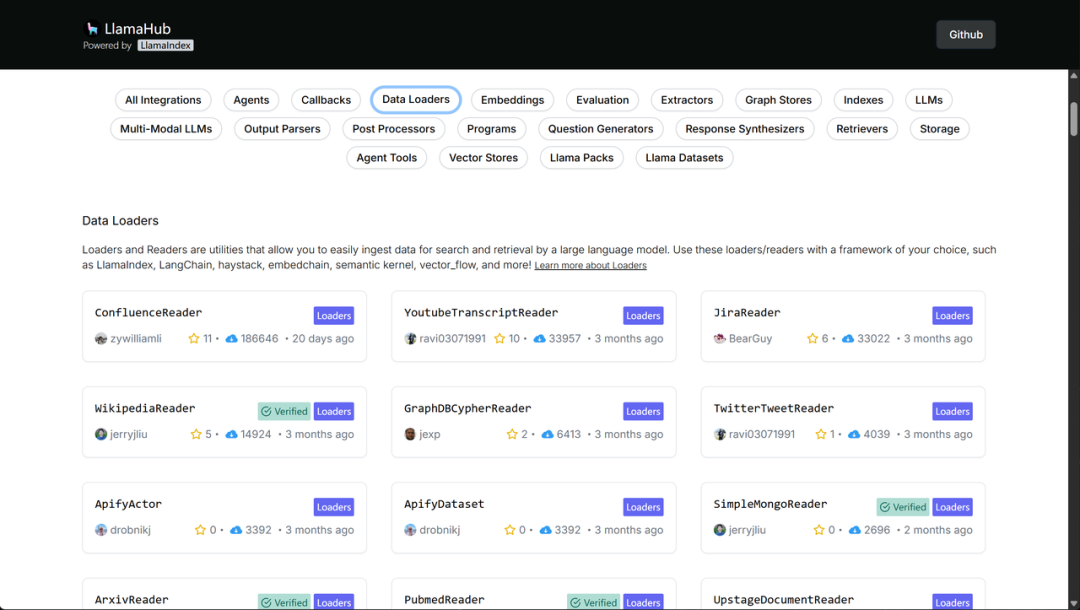 社区维护了超过 400 种数据加载器,覆盖了几乎所有主流数据源: