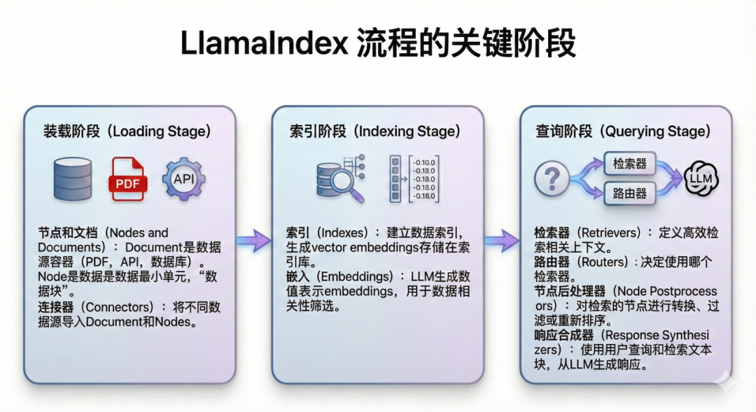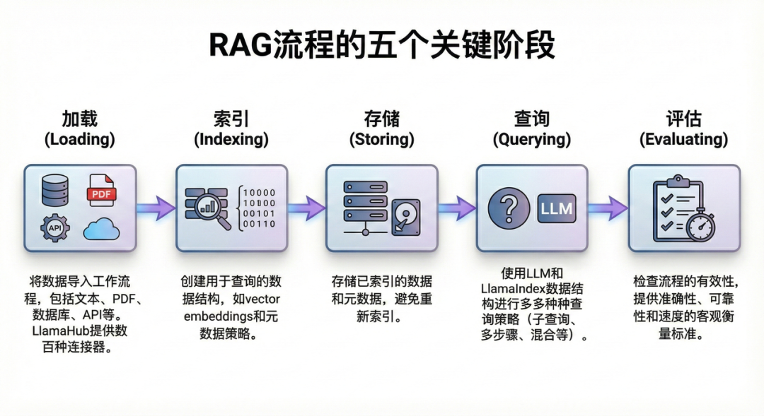 与许多仅关注“向量检索”单一环节的工具不同,Llama-Index 提供了从数据源头到最终评估的 RAG 全流程解决方案。它将 RAG 系统抽象为五个标准化的流水线环节,开发者可以在同一个框架内完成所有工作,无需拼凑多个零散的工具库。