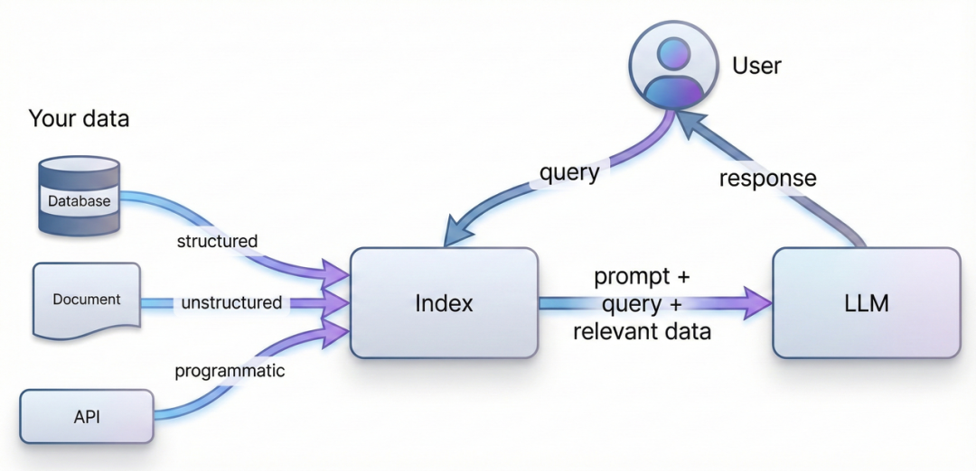 它不仅仅关注于如何向模型提问(Prompt Engineering),更侧重于数据管理(Data Management)的全生命周期,包括数据的摄入(Ingestion)、结构化索引(Indexing)以及高效检索(Retrieval)。其核心目标是打破私有数据孤岛,让 LLM 能够以最低的成本、最高的精度访问海量外部知识。
