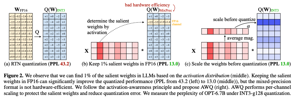 - 右图: AWQ 执行 per-channel 缩放以保护关键权重从而减少量化误差,这里可以看到缩放 weight 后再做量化的 PPL 为 13.0,缩放本身未对精度产生影响。