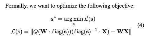 为了同时考虑关键权重和非关键权重,AWQ 选择自动搜索最佳(每个输入通道)缩放因子,使某一层量化后的输出差最小。这就把量化问题建模为如下的最优化问题: