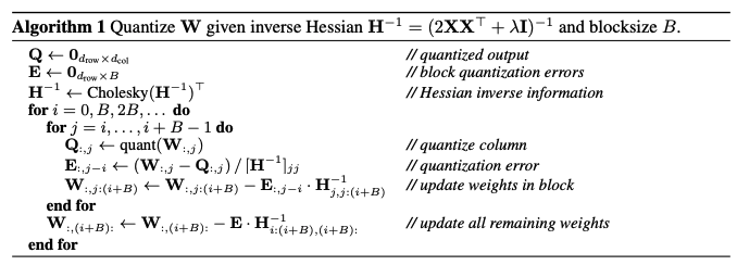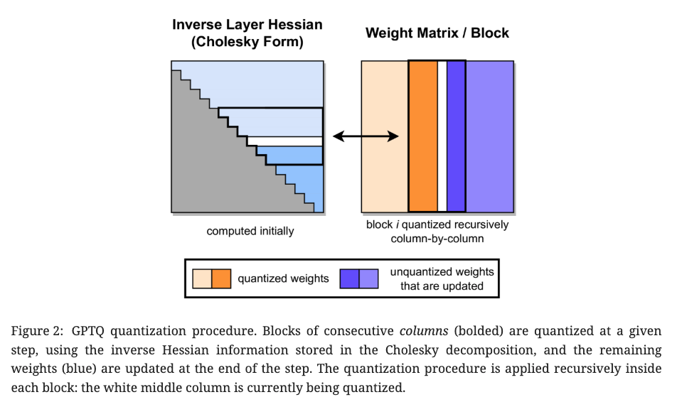 GPTQ 不一次性量化整个权重矩阵,而是 逐元素(或逐块)地量化权重。对每个权重,在量化时会根据 Hessian 的对角线项(近似二阶导信息)进行 误差校正,首先量化一个权重,然后更新剩余权重的“残差误差”,这相当于执行一次 逐步的高斯消元式校正,避免量化误差累积。