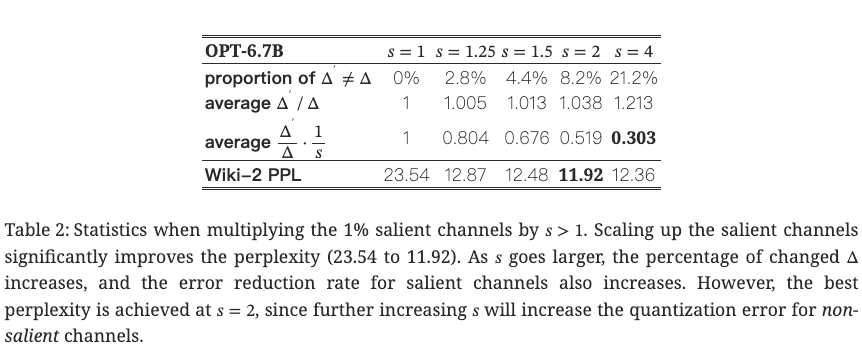 权重的缩放因子 s 为超参数,作者在OPT-6.7B模型上做了对比实验,发现当 s 比较大比如等于 4 时,非关键通道的相对误差将会增加(非显著通道的误差将被放大)。