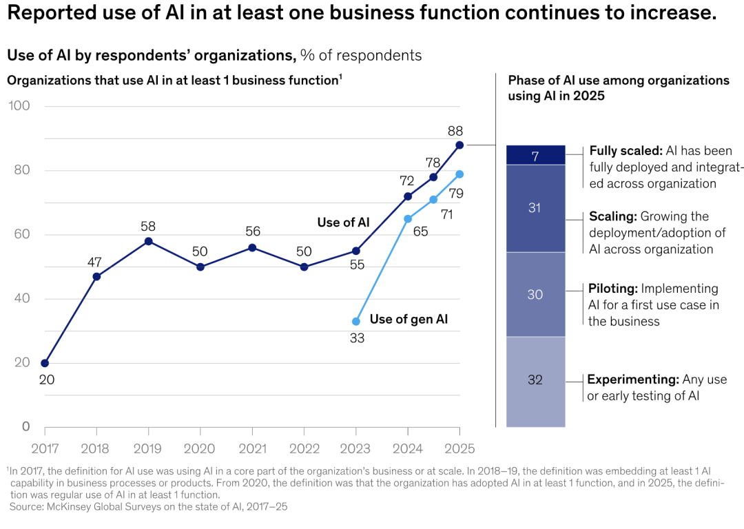 根据麦肯锡的统计,2017年时,只有20%企业使用AI;到了2025年,有88%企业都在深度应用AI。