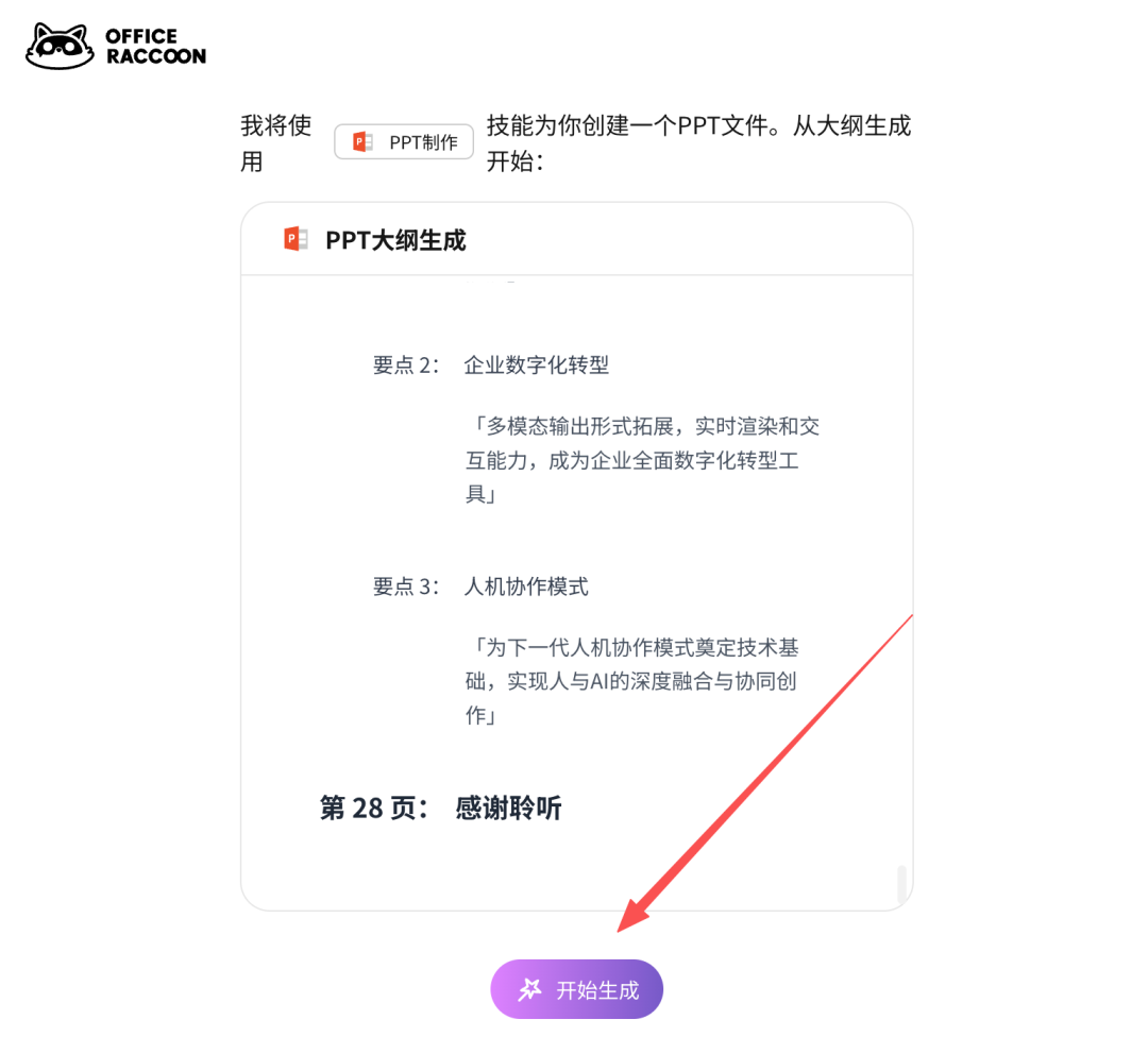 接收到需求后,办公小浣熊不会急于堆砌页面,而是先「理解」——