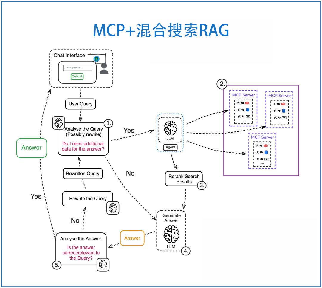 更进一步地,当MCP与混合搜索(hybrid search)技术结合形成新的RAG时,系统的检索生成能力得到更显著增强,相比于传统的RAG,速度、效果、准确性、幻觉抑制等方面有更为优异的表现。混合搜索融合了关键词匹配、向量语义检索乃至结构化查询、RRF等多种检索范式,能够在不同场景下灵活调用最合适的检索策略。MCP 则在此基础上,对来自多源、多模态检索结果进行统一上下文建模,确保大模型在生成响应时不仅“看到”了相关信息,还能“理解”这些信息之间的关联与优先级。这种协同机制让 AI 系统在面对复杂、动态或高度专业的问题时,既能快速定位关键事实,又能以连贯、准确的方式组织答案——真正实现从“能说会道”到“言之有据”的跃迁。
