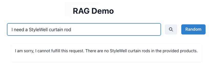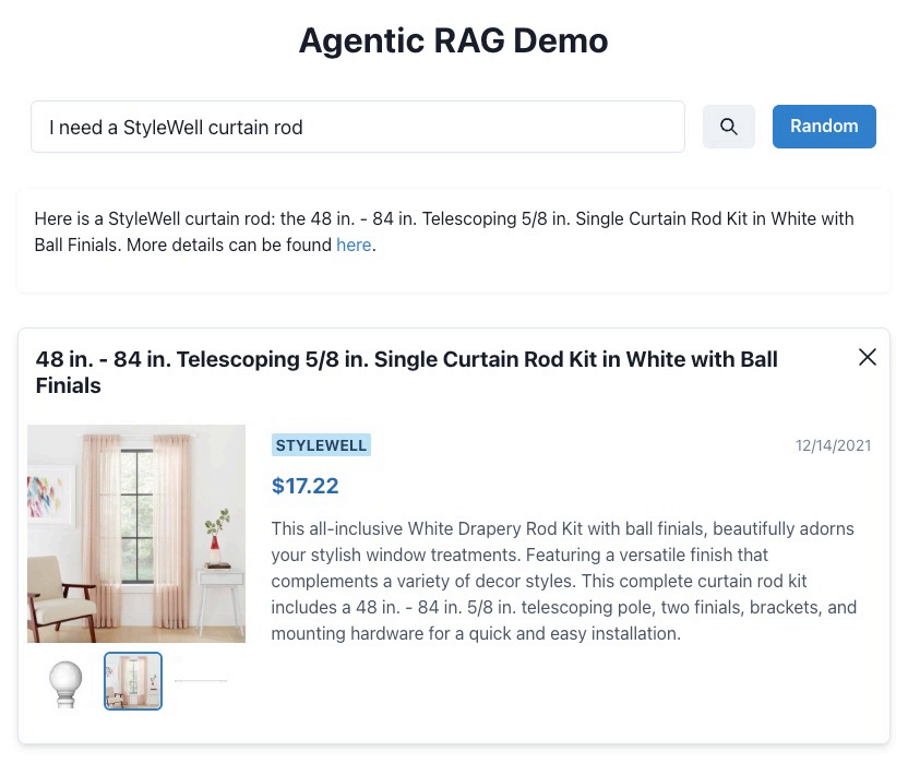 语义搜索帮助缩小了搜索范围,匹配“烧烤架”相关产品,并推荐得分最高的产品。按同样的模式,用户会预期找到“窗帘杆”产品,因此会输入“我需要一个StyleWell窗帘杆”这样的查询。