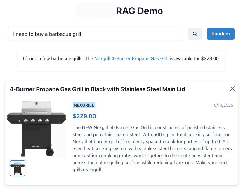 我们将为一个电子商务数据集使用语义搜索示例。如果用户想找“烧烤架”,自然语义搜索可以是:“我需要买一个烧烤架”: