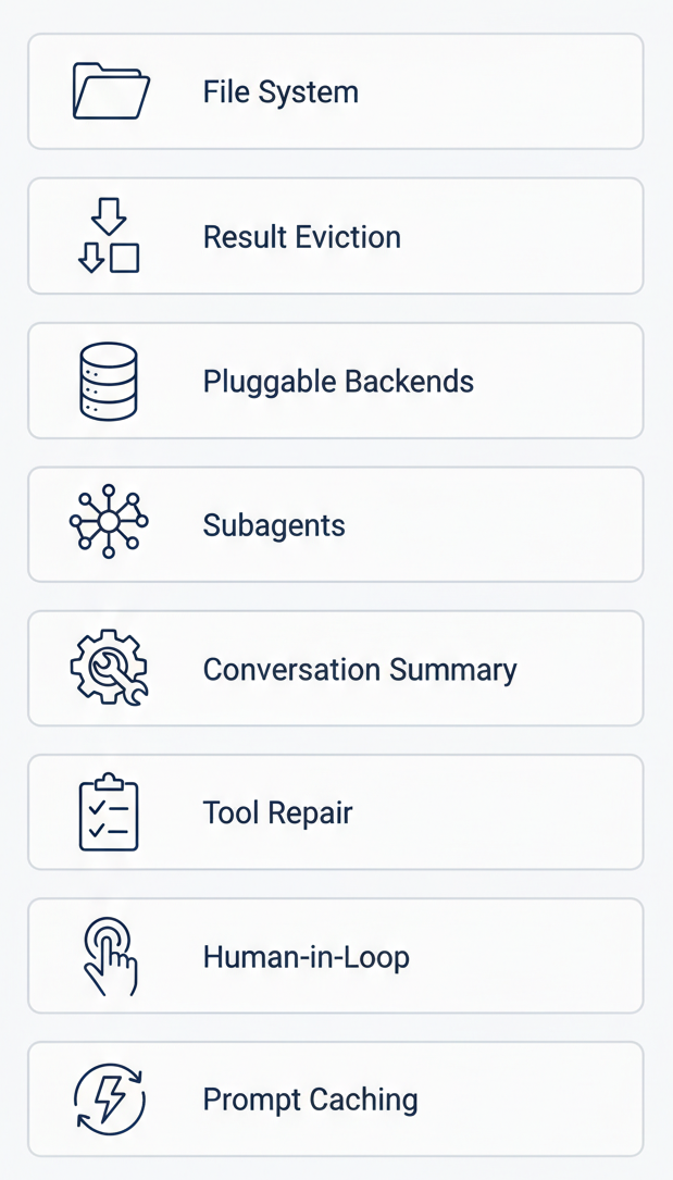LangChain团队将Deep Agents定位为“智能体工具套件”(Agent Harness),这一特性体现在九项核心能力上。这九项能力单看每一项都不新鲜,但整合在一起,就能生成一个经过深思熟虑的、会自我优化的、接近生产就绪的智能体系统。