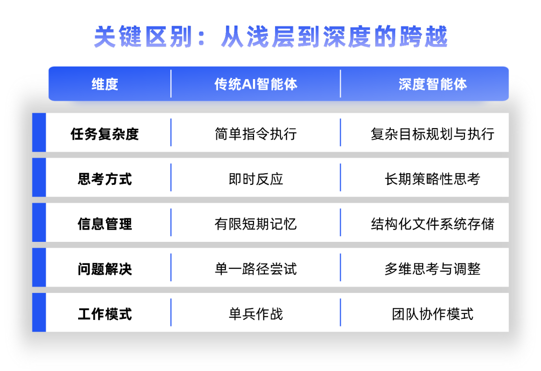 深度智能体(Deep Agents)正在改变这一现状——这也是Claude Code、Manus、Deep Research等智能体突然强大的背后推手。**如果说传统的 AI 应用是短跑选手,擅长快速响应简单指令;那新一代的深度智能体则更像马拉松运动员,能够规划路线、调整节奏、持续前进,最终完成复杂任务。**这种差异为AI的落地带来的不是量变,而是质变。它并不追求打造更强大的AI模型,而是为现有模型设计了一套更高效的工作系统,使得AI应用能够自主的理解复杂目标、制定执行计划并持续推进任务。