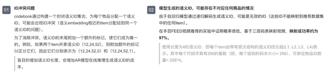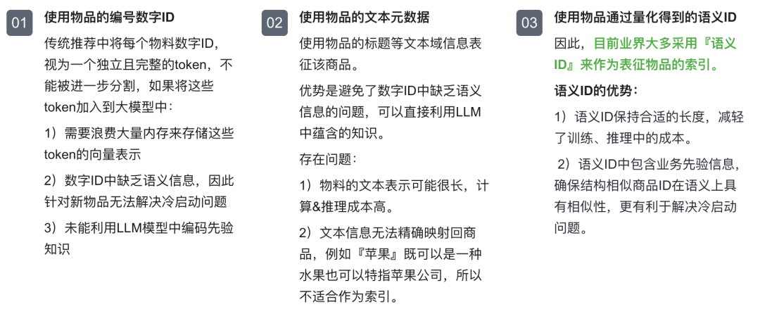 - 推荐中候选商品ID数量非常大(数亿+),因此直接基于原始的物品 ID训练LLM将导致词汇表非常大,并且推理效率低。