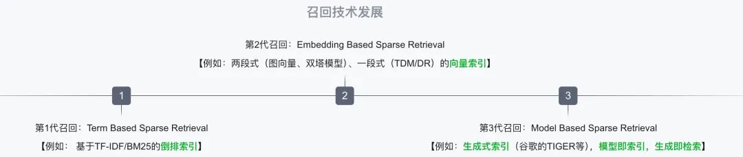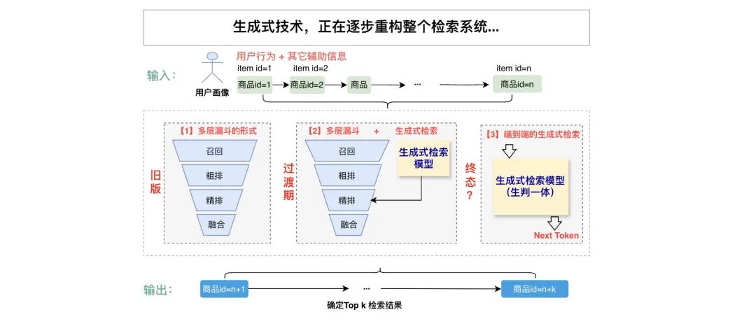 - 传统基于『多层漏斗的级联』的检索架构,逐步被端到端的生成式模型替代,有效的解决『多阶段目标不一致&漏斗层层折损』的难题,检索&研发效率进一步提升。