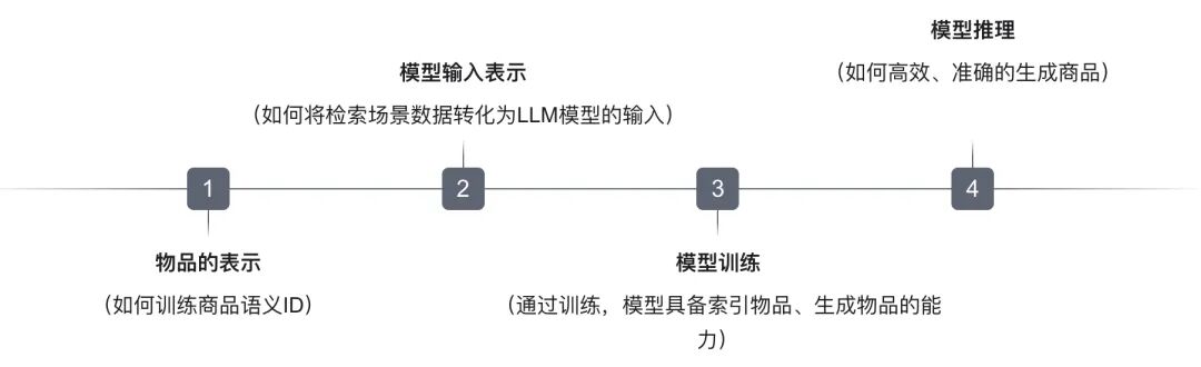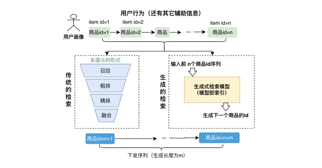 当前基于大模型技术的生成式检索,通过引入端到端的生成模型(如基于Transformer的自回归生成模型等),输入用户的历史行为序列作,模型直接生成待推荐商品ID,模型的参数充当了全库商品的索引,充分释放大模型的能力。