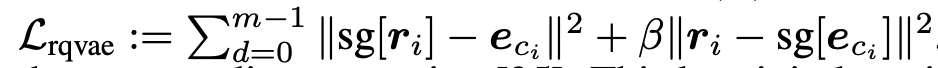 - 残差量化:(RQ-VAE):多级向量量化器,通过残差矢量从粗到细递归量化,以生成一组码字 (使用最近邻查找,将潜在向量映射到codebook中离散的嵌入向量,并返回向量下标,作为码字)
