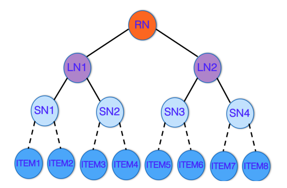**①叶子结点:代表所有的物品;②上层节点:**聚类虚拟出来的