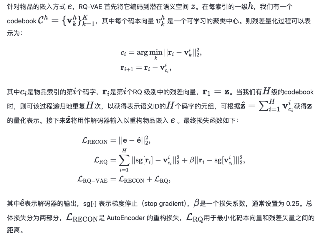- 损失函数:同时训练编码器、量化器(语义ID)、解码器