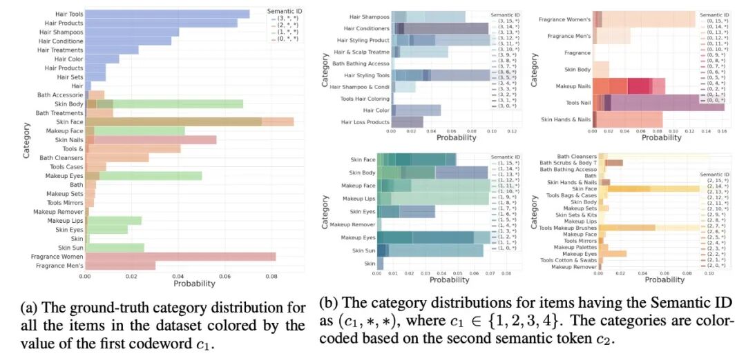 使用长度为4的语义ID,即每个item由带有层次结构的语义ID四元组(L1, L2, L3,L4)表示。其中每个代码字具有256的基数(即,每个级别的码本大小= 256),可表征物品ID数量= 256^4。