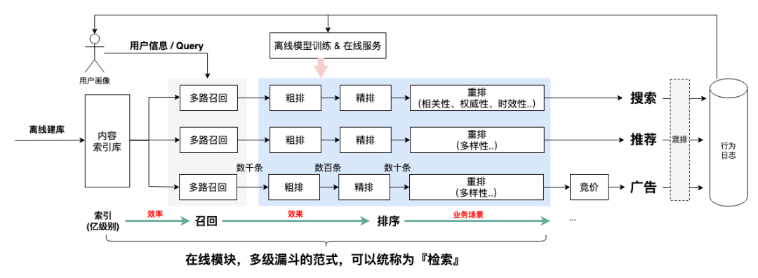 **(1)召回阶段:**基于简单、高效的方法(基于规则/策略的粗粒度匹配)来减少候选物料的数量(数亿->数千)