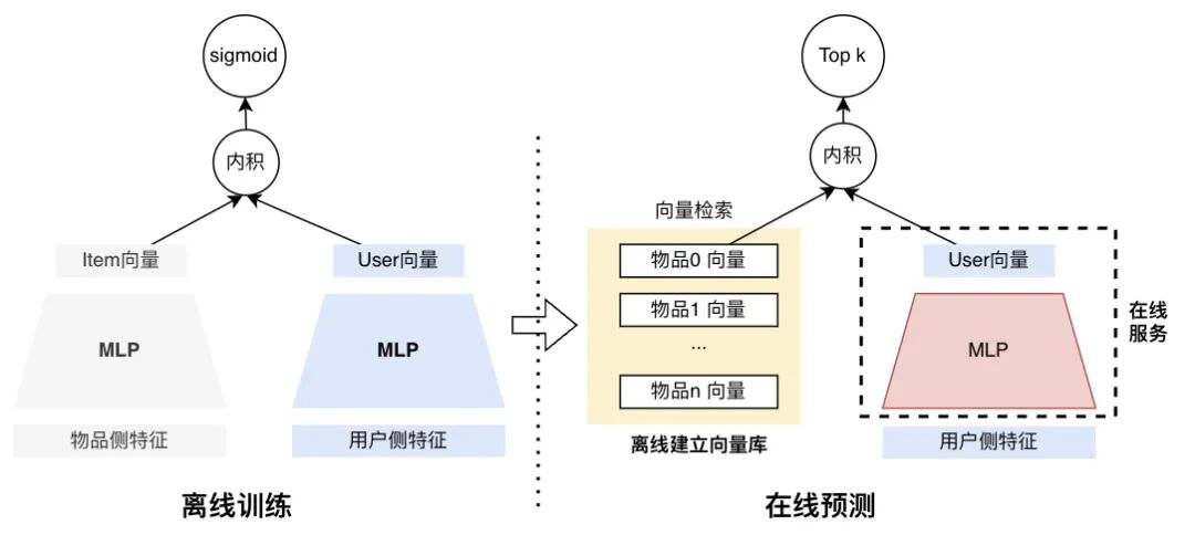 (2)建立向量库:在线通过计算内积的方式检索Top k