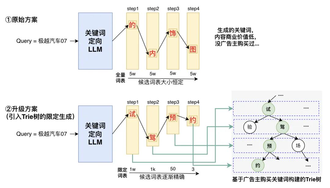LLM生成的关键词,可能不是广告主购买过的广告词(为无效关键词,原始方案中生成的关键词70%都是无效的),可控性需要提升。