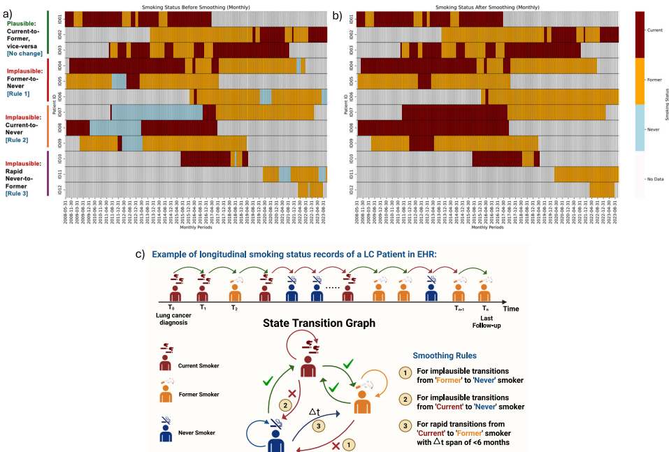 研究不仅关注于单次时间点的吸烟史提取,还通过引入基于规则的纵向平滑算法,解决了纵向数据中的不一致性问题。