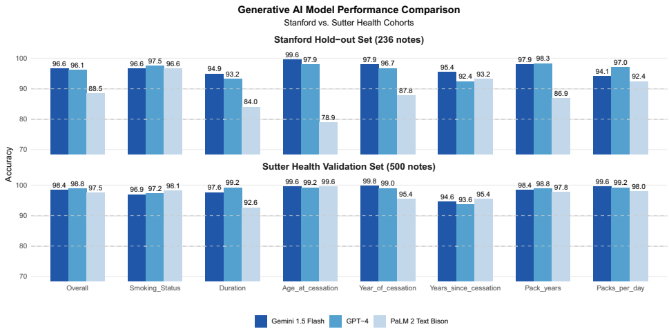 在斯坦福医疗保健(SHC)队列的测试集上,生成式LLM展现出显著优势。具体数据显示,Gemini 1.5 Flash和GPT-4在提取七项吸烟变量时整体准确率分别达到96.6%和96.1%,显著优于BERT系模型(准确率76.9%-82.5%)。