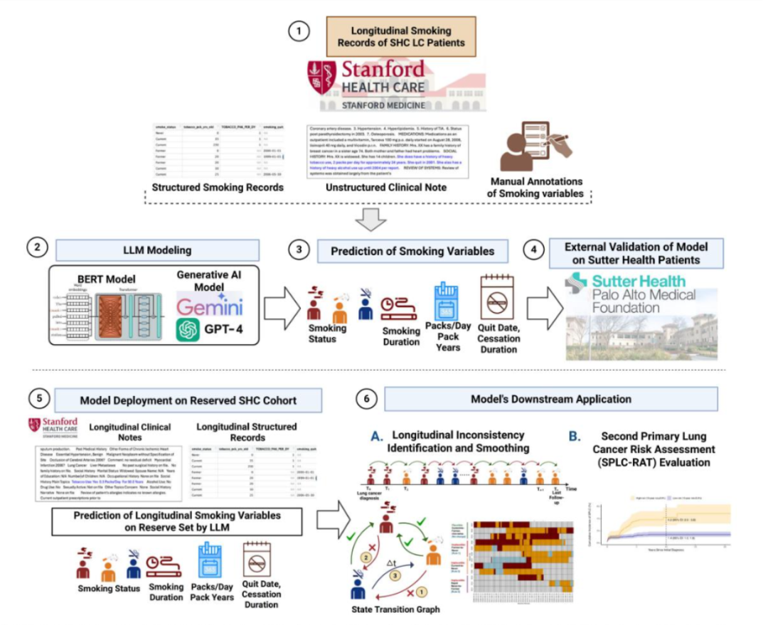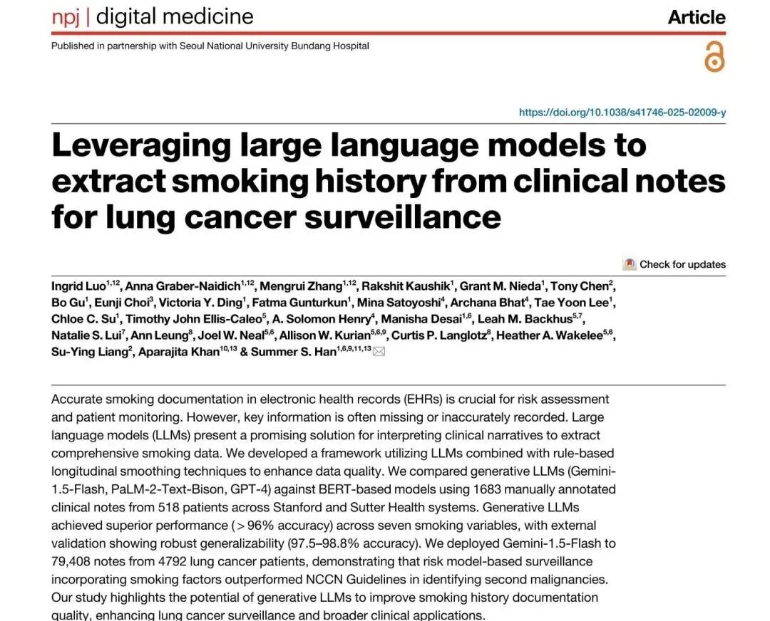 npj Digital Medicine期刊上发表了一篇文章《Leveraging large language models to extract smoking history from clinical notes for lung cancer surveillance》,该研究聚焦于利用生成式大型语言模型(LLMs)从电子健康记录(EHR)的临床笔记中自动化提取吸烟史数据,并通过结合基于规则的纵向平滑技术解决文档不一致性问题,以提升肺癌监测的准确性和可靠性。研究在斯坦福和Sutter Health系统的多中心数据中验证了LLMs(如Gemini-1.5-Flash和GPT-4)在提取吸烟状态、包年、戒烟时间等七项变量上的高精度(>96%),并成功部署至4792名肺癌患者的大规模纵向数据中,证明基于吸烟史的风险模型在识别第二原发肺癌(SPLC)方面优于NCCN指南和USPSTF标准,突出了LLMs在优化临床决策支持和精准医疗中的学术价值与应用潜力。