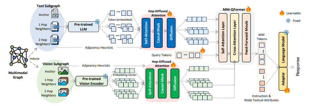 本图展示了Graph4MM框架的整体结构,详细说明了该框架如何将多模态数据(文本、图像)与图结构信息相结合,以实现高效的多模态学习。框架的核心在于通过Hop-Diffused Attention机制和MM-QFormer模块,将多跳邻居的结构信息融入到多模态数据中,并传递给下游的基础模型(如大型语言模型)以完成生成或判别任务。