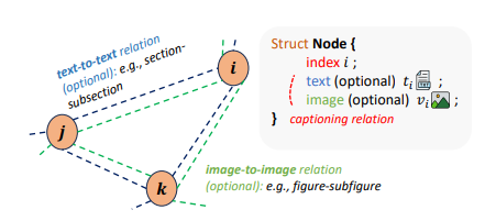 本图展示了多模态图的建模方式,其中节点代表不同模态的数据元素,例如文本段落、图像及其标题等。每个节点通过唯一的索引标识,并且可以包含可选的文本属性和视觉属性。例如,一个节点可以代表文档中的一个章节,其文本属性是该章节的内容,而视觉属性可能是与该章节相关的图像。图中的边表示节点之间的关系,包括文本到文本的关系(如章节之间的层次关系)、图像到图像的关系(如图像之间的共引用关系)以及文本到图像的关系(如图像和其标题之间的配对关系)。通过这种建模方式,可以构建出一个包含多种模态数据及其相互关系的图结构,为后续的多模态学习任务提供了基础。这种图结构不仅能够捕捉单模态内的信息,还能有效表示不同模态之间的交互,为模型提供丰富的上下文信息,从而更好地理解和生成多模态内容。