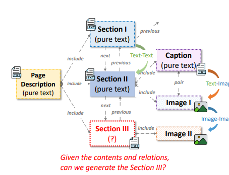 本图展示了一个多模态文档中的复杂结构化关系,其中文档的不同部分(如章节、图像、标题和页面描述)被建模为一个图结构。图中的节点代表文档的不同组成部分,例如“Section I”、“Section II”、“Image”、“Caption”等,而边则表示这些组成部分之间的语义依赖和共引用关系。例如,图像与标题之间存在直接的配对关系,而图像与后续章节内容以及页面总结之间的关系则更为复杂。这种结构化图能够捕捉多模态数据之间的复杂交互,而不仅仅是简单的图像-文本配对。图1的核心目的是说明在多模态学习中,通过建模这种复杂的结构化关系,可以更有效地利用上下文信息来生成或理解文档内容。