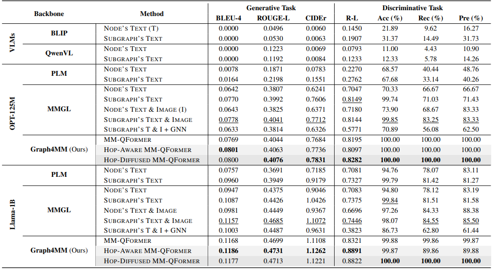 本表展示了 Graph4MM 框架在不同基准模型和输入设置下的性能比较,涵盖了生成任务和判别任务。表中列出了多种方法在不同任务上的关键性能指标,包括 BLEU-4、ROUGE-L、CIDEr(用于生成任务)以及准确率(Acc)、召回率(Rec)和精确率(Pre)(用于判别任务)。从表中可以看出,Graph4MM 的不同变体(如 MM-QFormer、Hop-Aware MM-QFormer 和 Hop-Diffused MM-QFormer)在所有任务中均优于预训练的视觉-语言模型(VLMs)、大型语言模型(LLMs)和多模态图学习方法(MMGL)。具体来说,Graph4MM 在生成任务中平均提升了 1.77%,在判别任务中平均提升了 12.09%。这表明 Graph4MM 通过整合多跳结构信息和改进的多模态融合机制,能够更有效地处理复杂的多模态关系,从而在生成和判别任务中均取得了显著的性能提升。