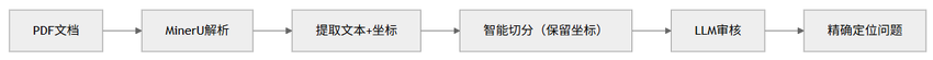 - VLM方案:其返回结果中缺乏精确的坐标映射,通常只能给出模糊的页码或段落描述,无法支持后续的PDF批注、高亮标记等可视化功能。这对于需要生成审核报告并在原文档上标注问题的场景来说是致命缺陷。